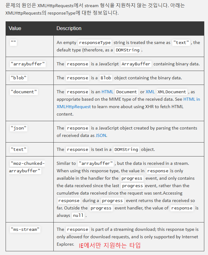 XMLHttpRequest는 stream 타입을 지원하지 않기 때문이다