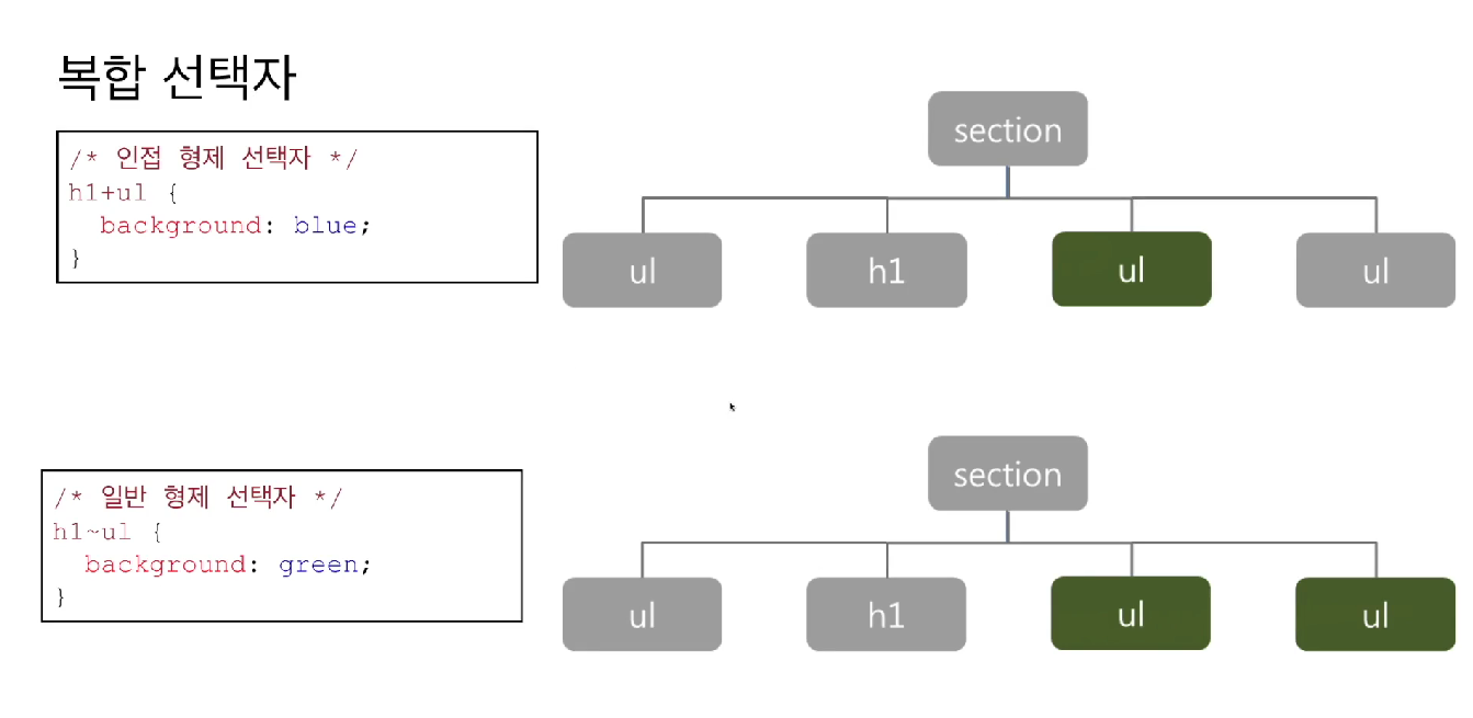 h1~ul {} 선택자는 <h1> 태그에 있는 같은 <ul>태그들에만 적용되는 선택자라는 뜻이다