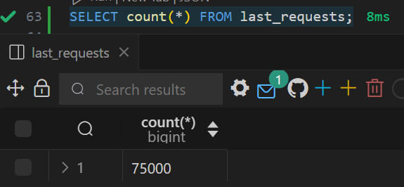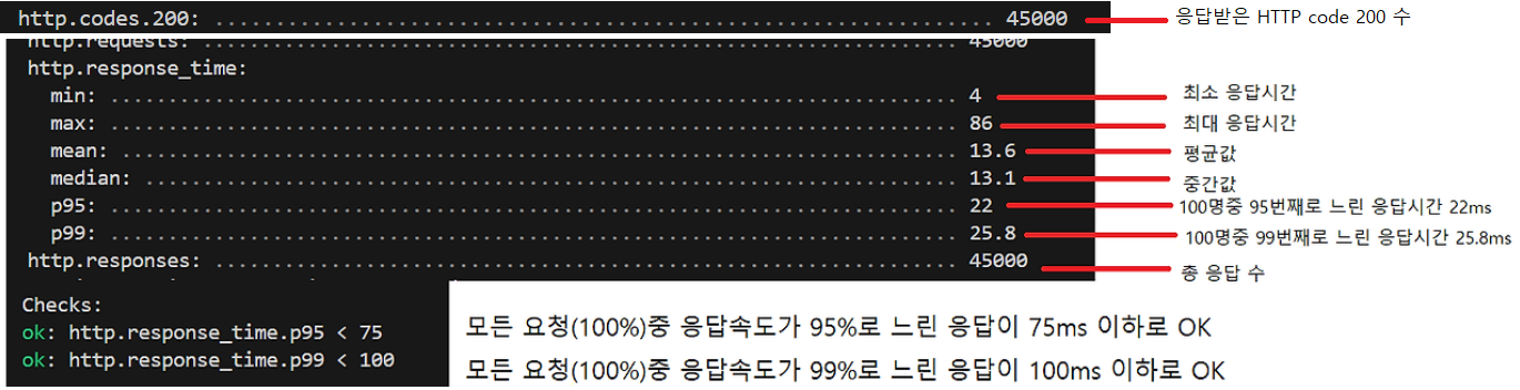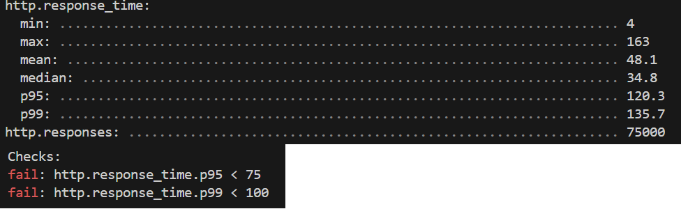 총 75000번의 작업을 했는데 이번에는 p95가 120.3ms, p99가 135.7ms로 fail이 나왔다