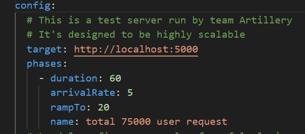 Artillery 라이브러리를 이용해서 60초 동안 5명의 유저를 시작으로 초당 10명씩 요청하는 유저가 증가하게 셋팅했다
